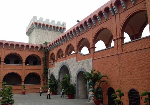 Khoảng sân đá rộng ở trung tâm được bao bọc bởi những tầng nhà xây gạch đỏ. |