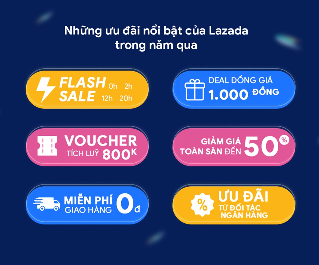 Trong cuộc đua tạo vị thế trong lĩnh vực TMĐT, hiếm có sàn TMĐT nào liên tục tung số lượng voucher giảm giá với số lượng lớn và có giá trị như Lazada. “Cơn mưa voucher” từ sàn TMĐT này đa dạng: Giảm giá của người bán, ưu đãi của sàn, miễn phí vận chuyển, ưu đãi từ đơn vị thanh toán và voucher tích lũy độc quyền của Lazada. Nhờ đó, người dùng có thể áp dụng cùng lúc 5 loại voucher giảm giá trong 1 đơn hàng, giúp tối ưu chi phí mua sắm nhưng vẫn kịp thời bỏ túi những sản phẩm chất lượng. Ngoài ra, trong một số chương trình, Lazada còn có chính sách hoàn tiền đến 12% cho các đơn hàng đã mua.