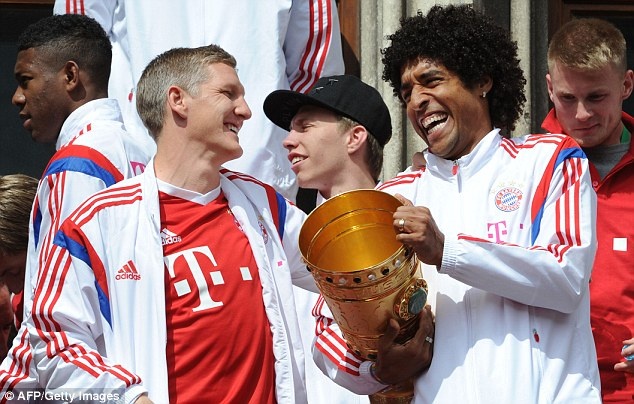 | Schweinsteiger và Dante hớn hở nâng cúp QG Đức. |