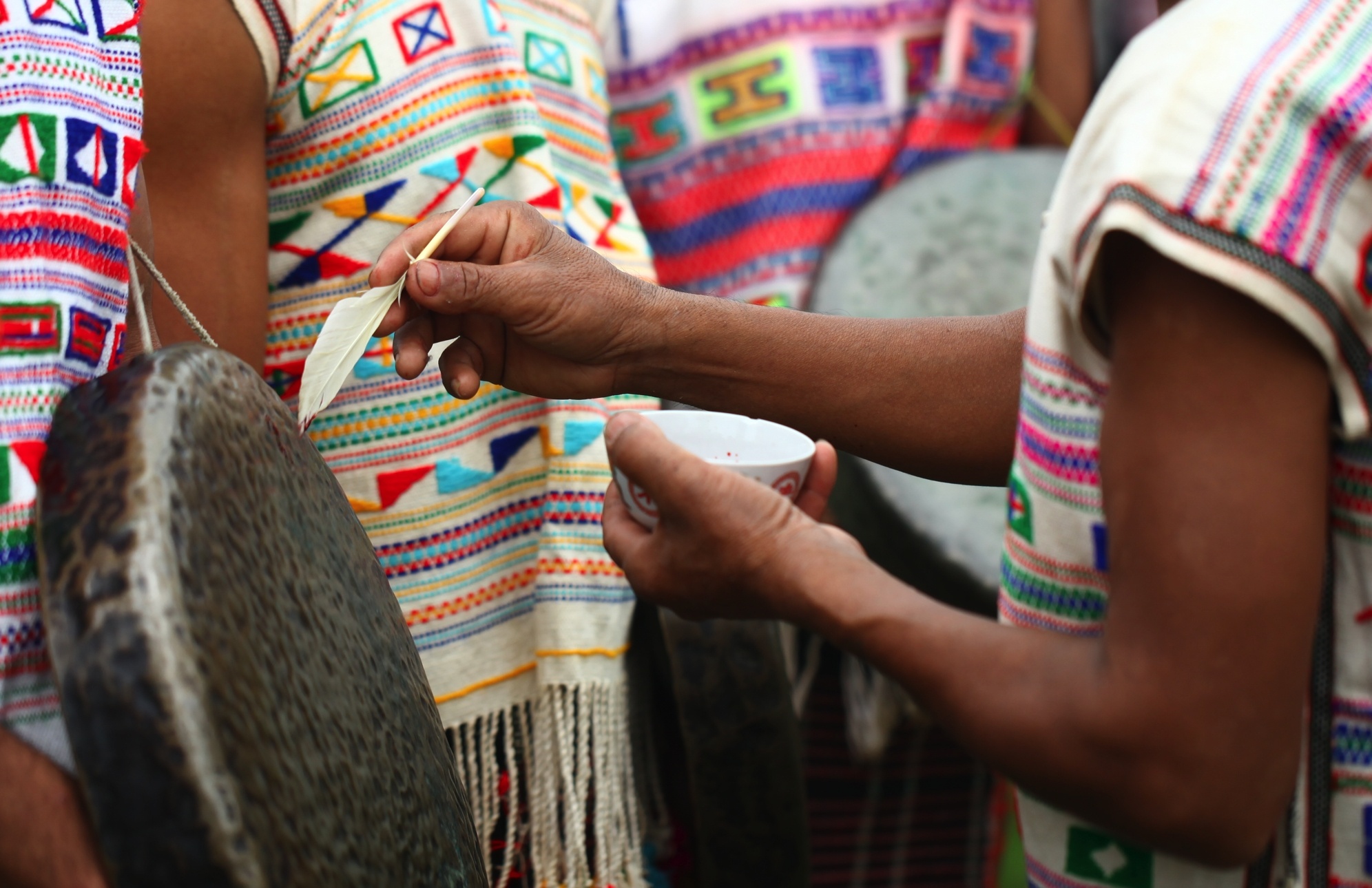 Già làng dùng máu hiến sinh quệt vào chiếc chiêng với mong muốn chiêng sẽ sống mãi với văn hoá người Mạ.