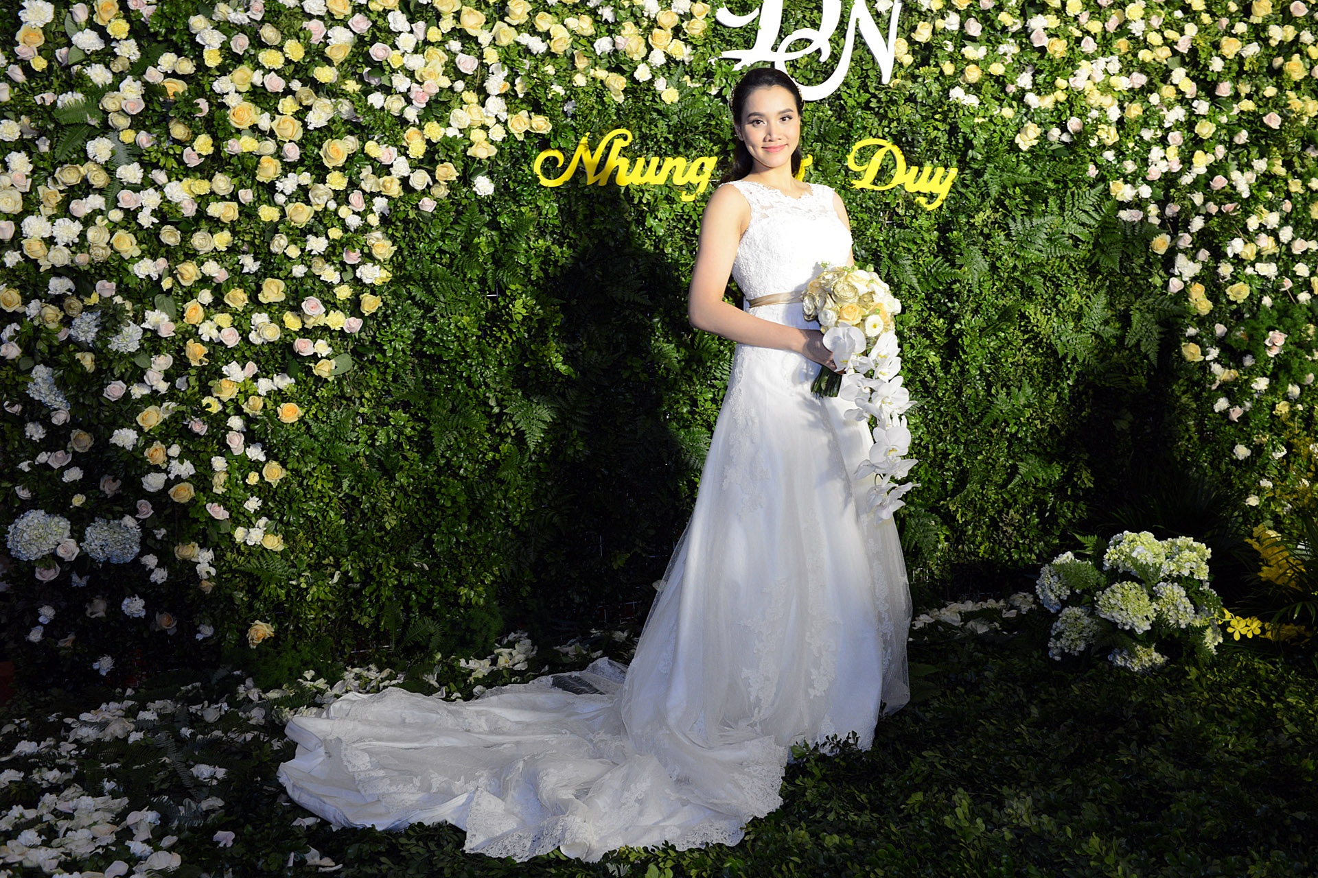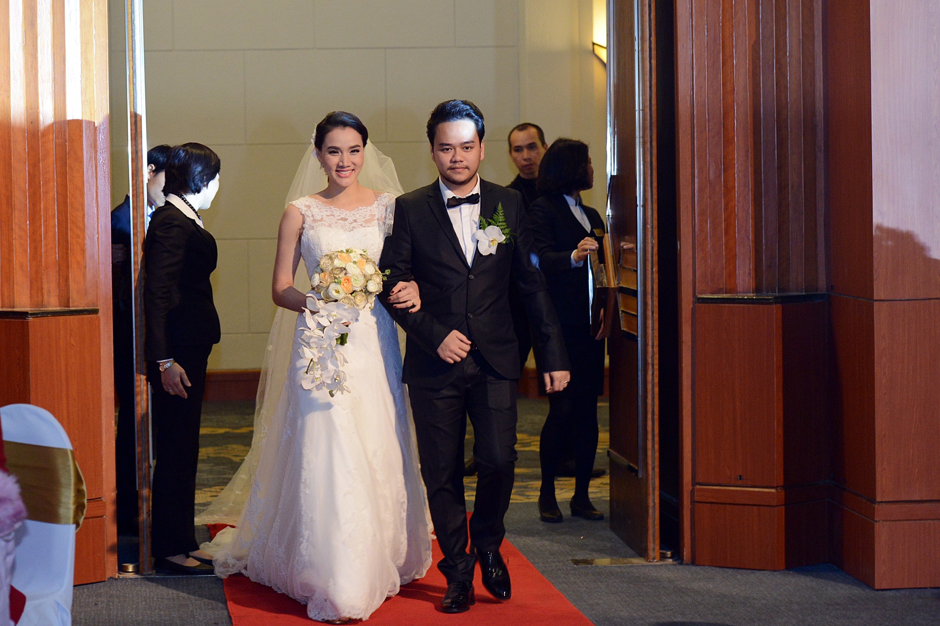 | Sau phần đón khách ở sảnh tiệc, Trang Nhung khoác tay ông xã Hoàng Duy bước vào tiệc cưới, cả hai tiến đến sân khấu trong sự cổ vũ nhiệt tình của khách mời. Cô dâu diện áo cưới trắng tinh khôi rạng rỡ bên chú rể. |
