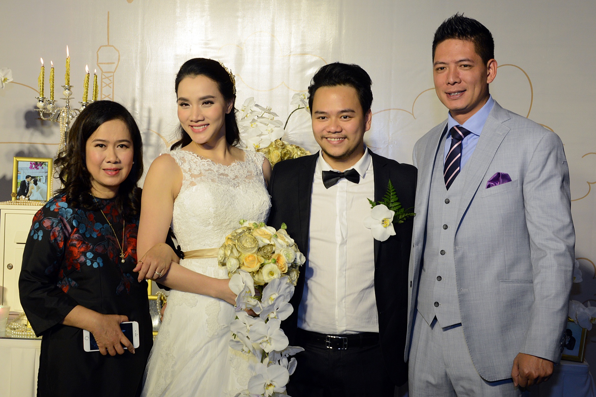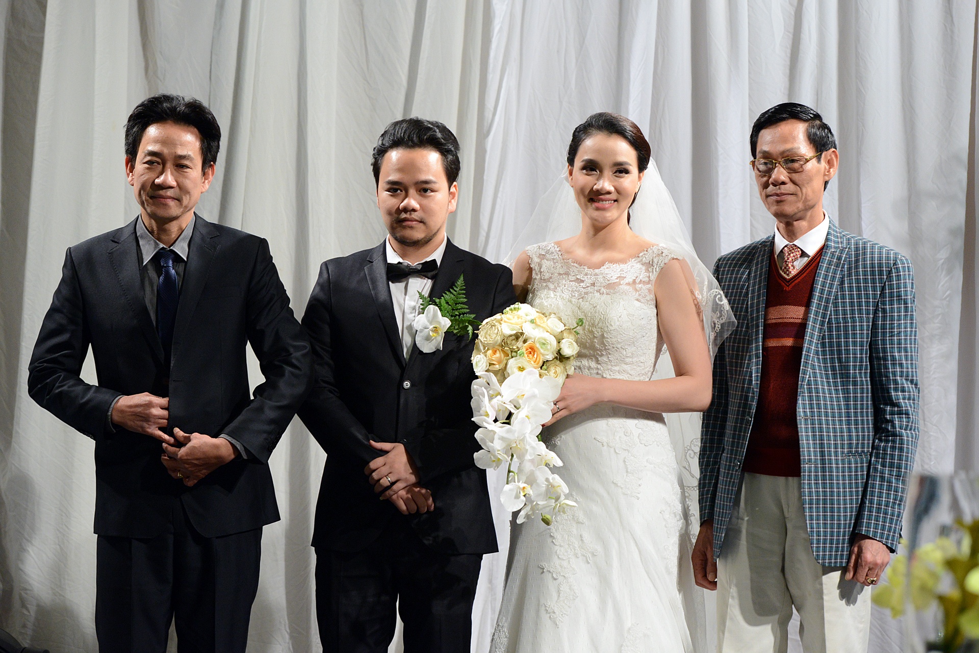 | Vợ chồng Trang Nhung rạng rỡ khi chụp ảnh cùng hai ông bố trên sân khấu. |
