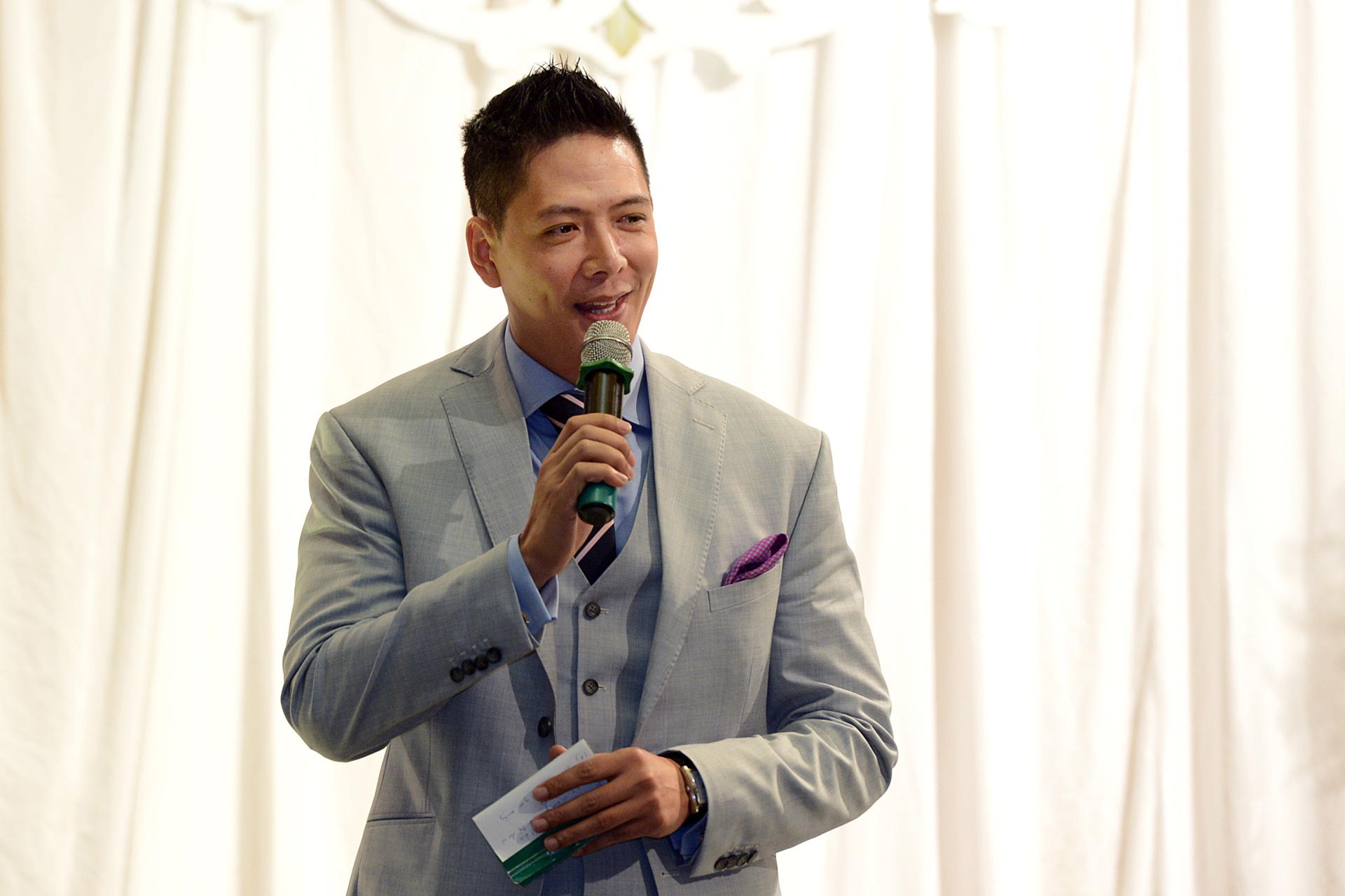 | Binh Minh đảm nhận vai trò MC tiệc cưới. Anh diện bộ vest lịch lãm. |