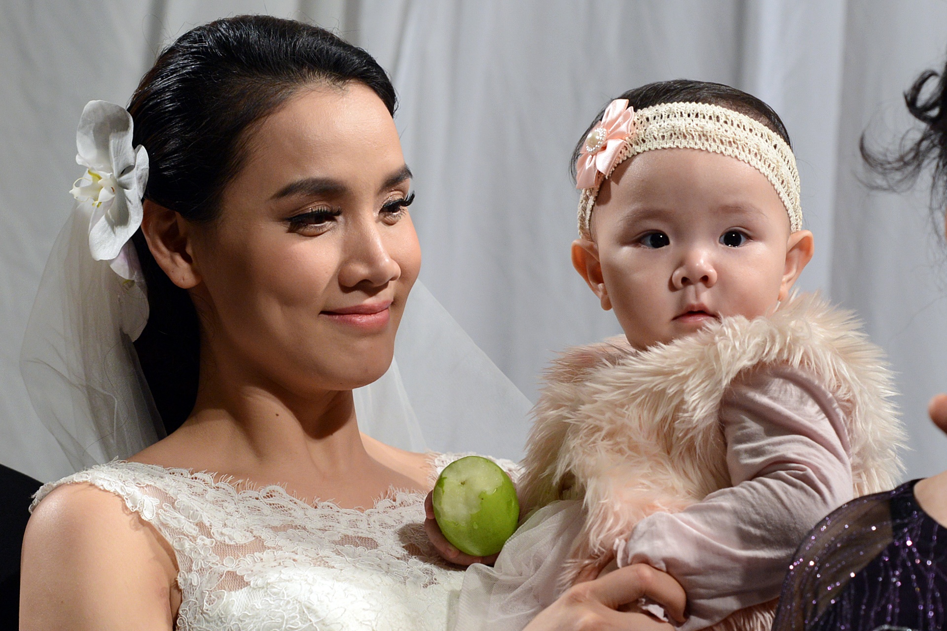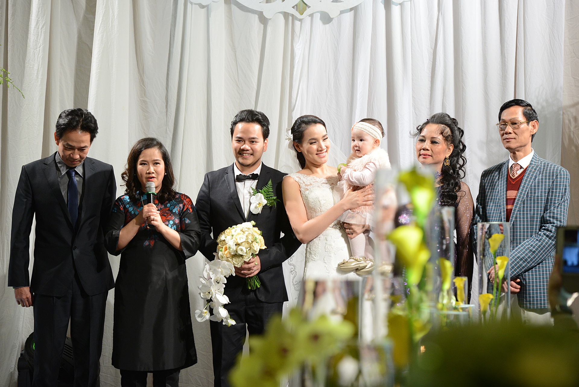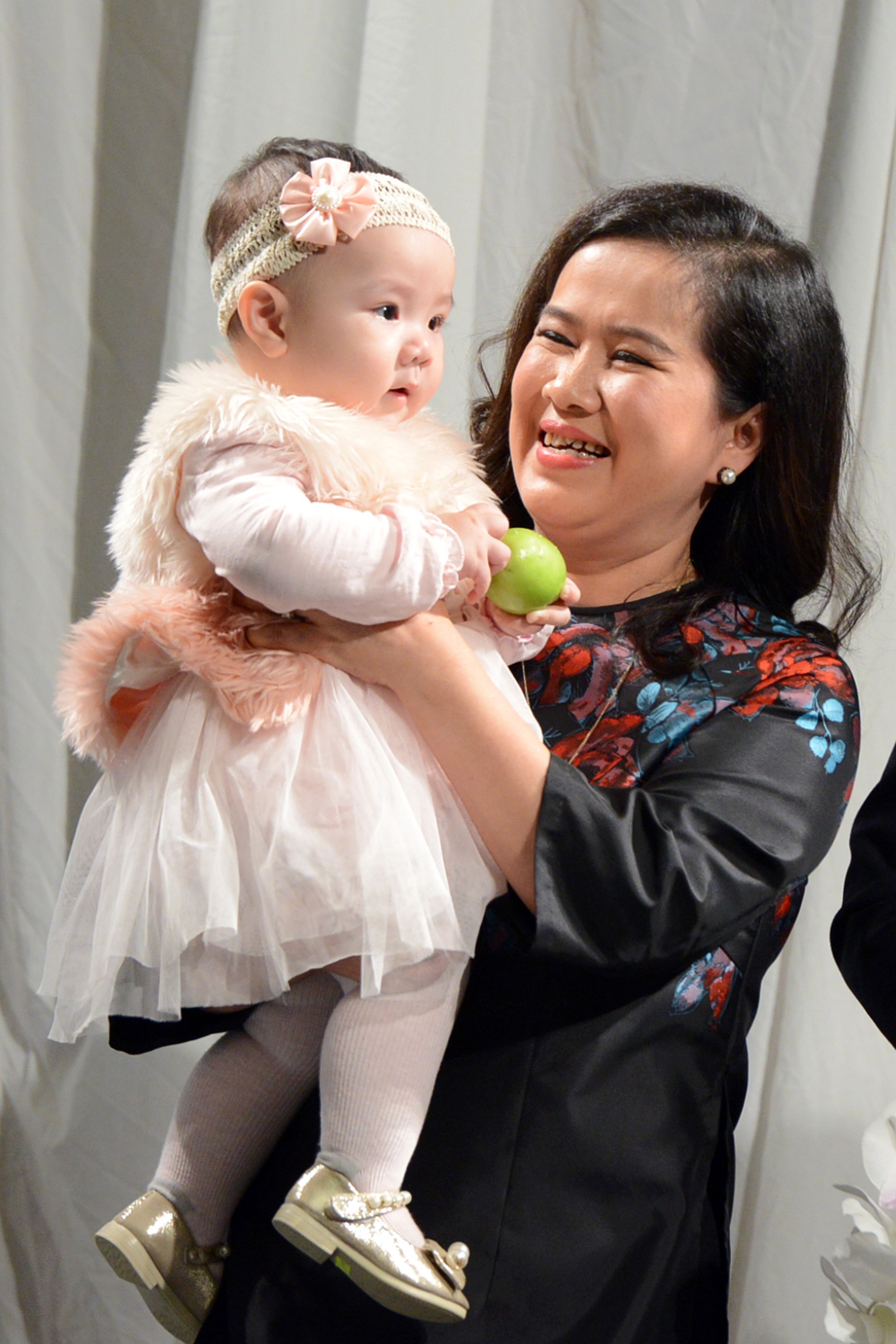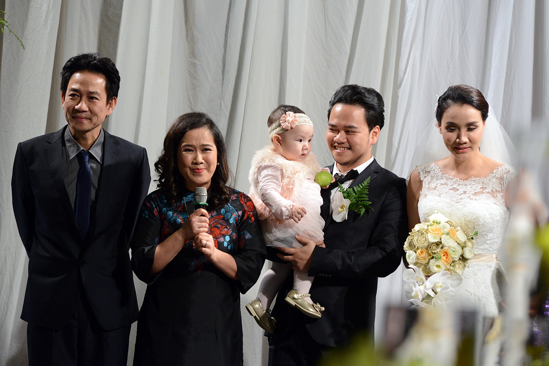 | Mẹ chồng diễn viên Kính thưa osin - nhà văn Nguyễn Thị Thu Huệ - bế cháu gái Vani lên sân khấu để làm lễ cùng bố mẹ. Nữ nhà văn không giấu niềm hạnh phúc. |