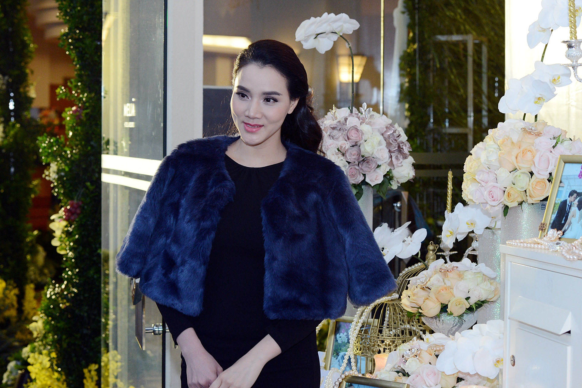 | Trước giờ diễn ra hôn lễ, vợ chồng Trang Nhung - Hoàng Duy đến khách sạn sớm để kiểm tra các khâu chuẩn bị. Trong ảnh, nữ diễn viên Kính thưa osin diện đầm tối màu kèm áo khoác lông sành điệu. |