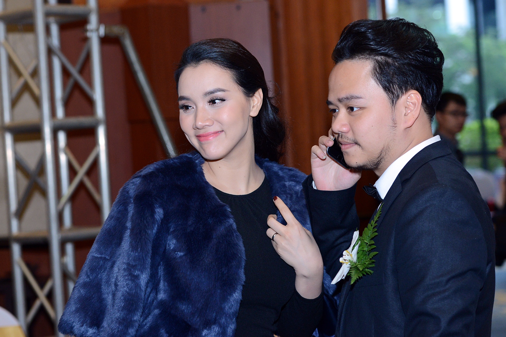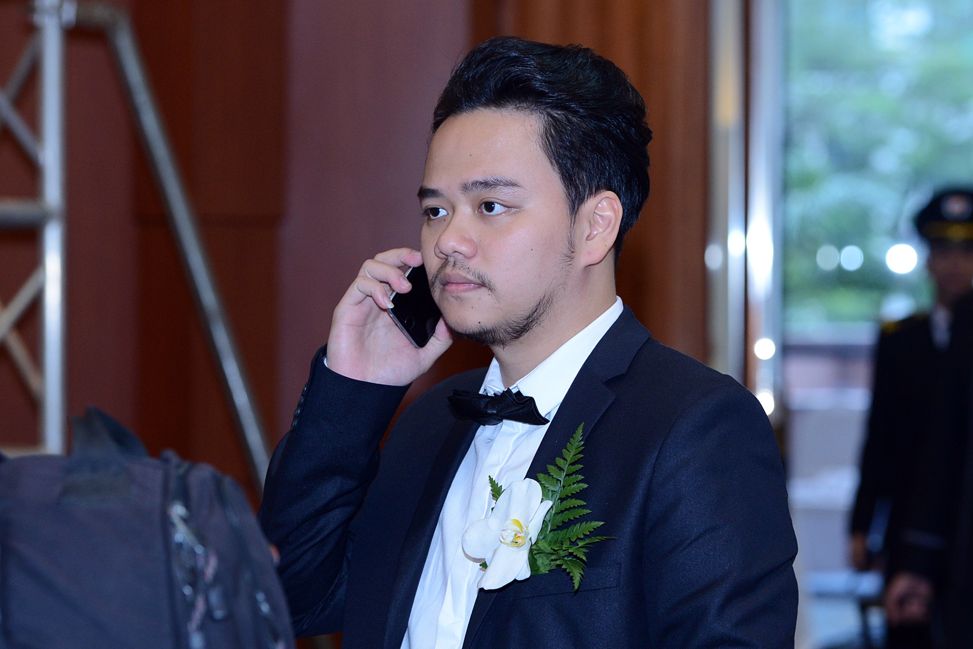 | Đạo diễn Hoàng Duy bận rộn với các cuộc gọi công việc. Anh bảnh bao trong bộ vest chú rể tối màu. |