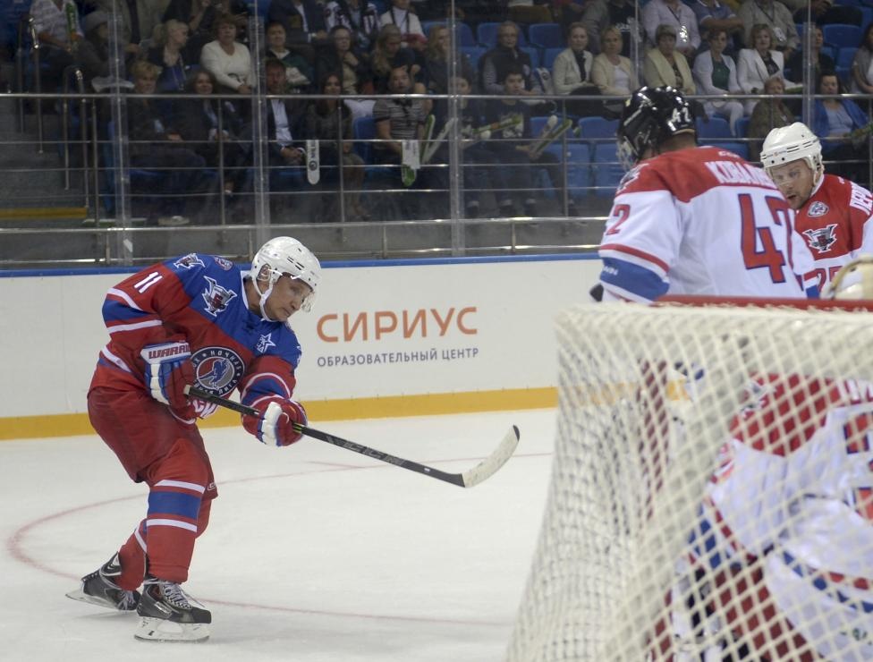 Tổng thống Nga chơi khúc côn cầu trên băng ở Sochi nhân dịp sinh nhật lần thứ 63 hôm 7/10. Ông chủ Điện Kremlin đã ghi 7 bàn thắng trong trận đấu. Tổng thống Nga là người nổi tiếng ưa thích các môn thể thao mạnh mẽ và có khả năng điều khiển nhiều loại máy bay của Không quân Nga. Ảnh: Reuters |