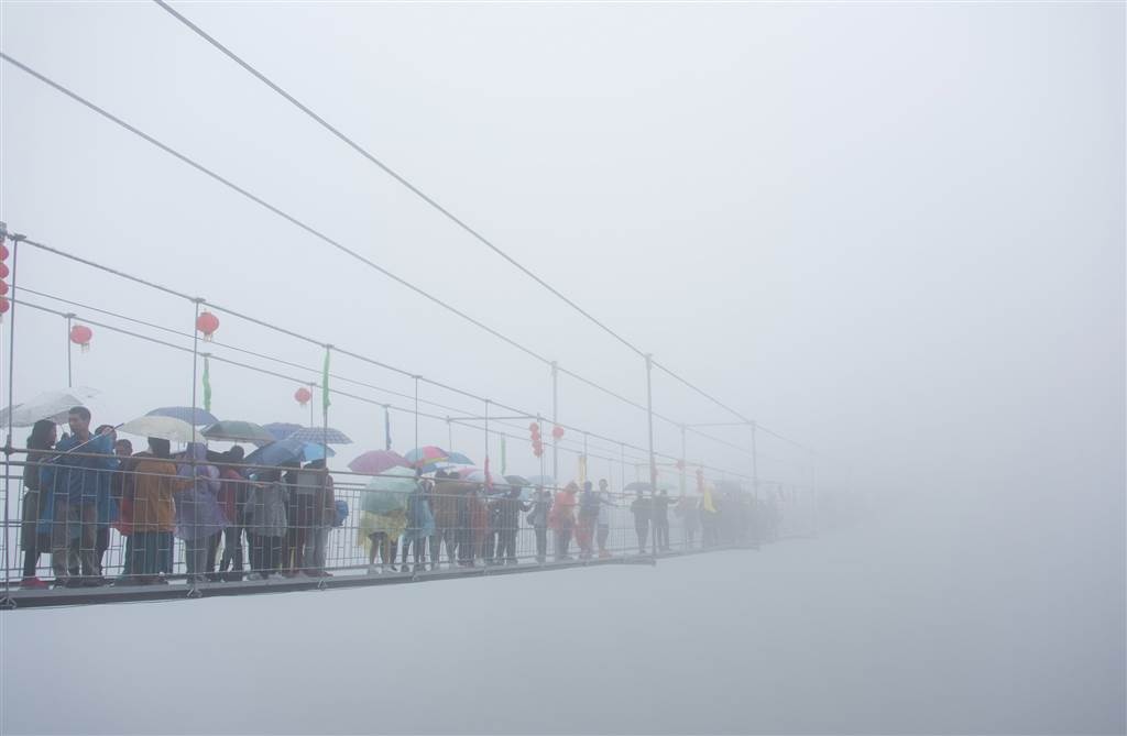 Du khách Trung Quốc đứng trên cây cầu được làm từ kính trong suốt ở tỉnh Hồ Nam khi nó chìm trong mây hôm 6./10. Cây cầu dài hơn 300 m, bắt qua một thung lũng sâu 200 m. Du khách đứng trên cầu có thể quan sát toàn cảnh, bao gồm cả cảnh vật phía dưới. Ảnh: AFP |