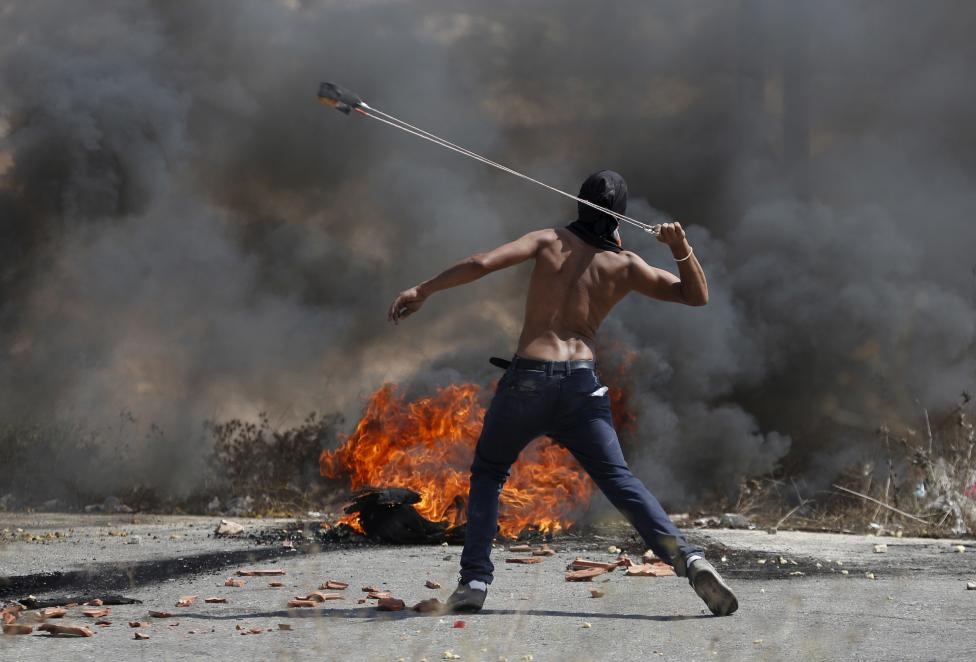 Người biểu tình Palestine tấn công cảnh sát và binh lính Israel bằng vũ khí tự chế gần thành phố Bờ Tây Ramallah hôm 5/10. Các khu định cư của người Do Thái là nguyên nhân của các cuộc đụng độ. Ảnh: Reuters |