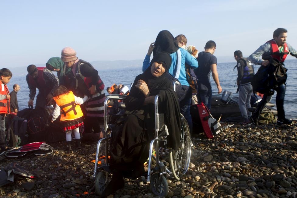 Người nhập cư Iraq ngồi trên chiếc xe lăn sau khi con thuyền nhỏ chở họ tới được đảo Lesbos, Hy Lạp. Theo Liên Hợp Quốc, 400.000 người tị nạn đã tới Hy Lạp trong năm 2015. Họ tìm đường tiến sâu hơn vào châu Âu với hy vọng đổi đời. Ảnh: Reuters |