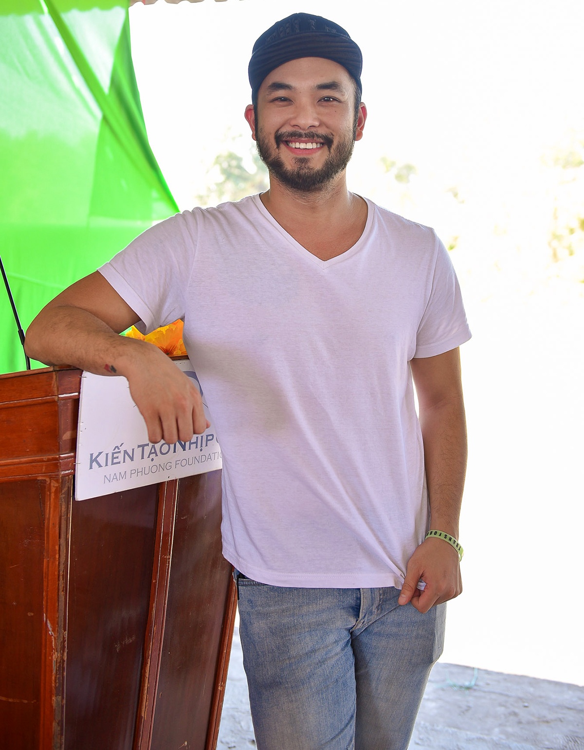 Ảo thuật gia kiêm diễn viên Petey Nguyễn năng nổ phát quà cho người dân nghèo nơi đây. |