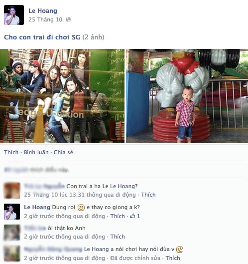 Cách đây không lâu, Lê Hoàng, thành viên nhóm The Men chia sẻ lên trang cá nhân chùm ảnh của cậu nhóc khoảng chừng hơn một tuổi cùng với chú thích: "Dẫn con trai đi chơi SG". Những hình ảnh này khiến các fan khá tò mò, liệu đây có phải con của Lê Hoàng không hay chỉ là một câu nói đùa. Bất ngờ, nam ca sĩ vào trả lời: "Đúng rồi, em thấy có giống anh không?" khiến các fan càng tin tưởng rằng Lê Hoàng đã bí mật có con.