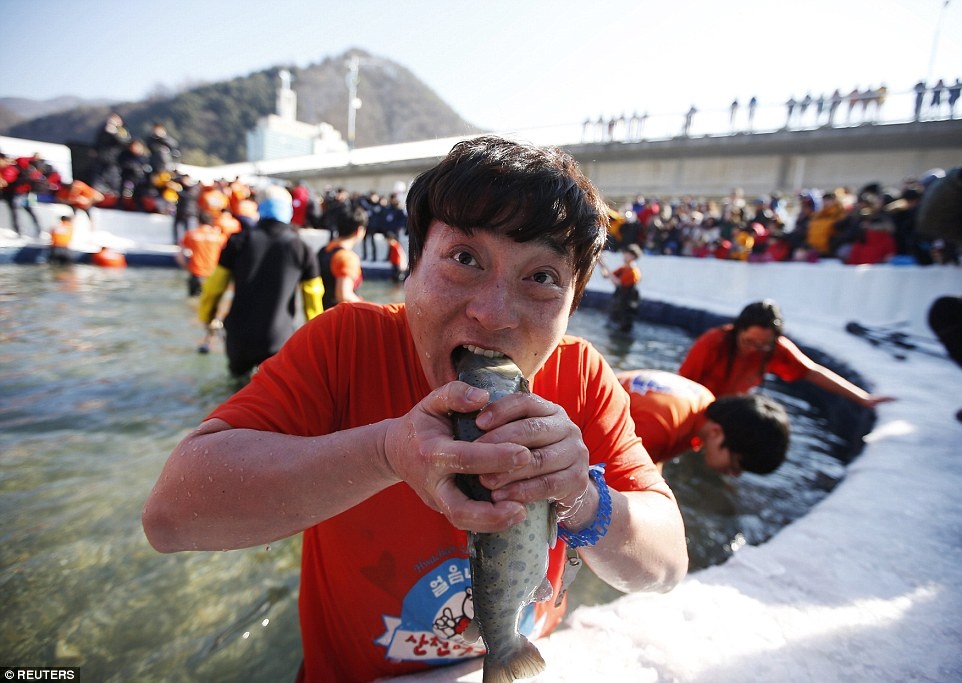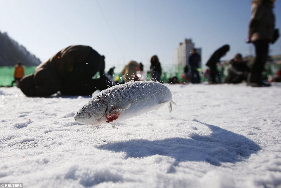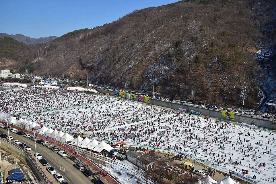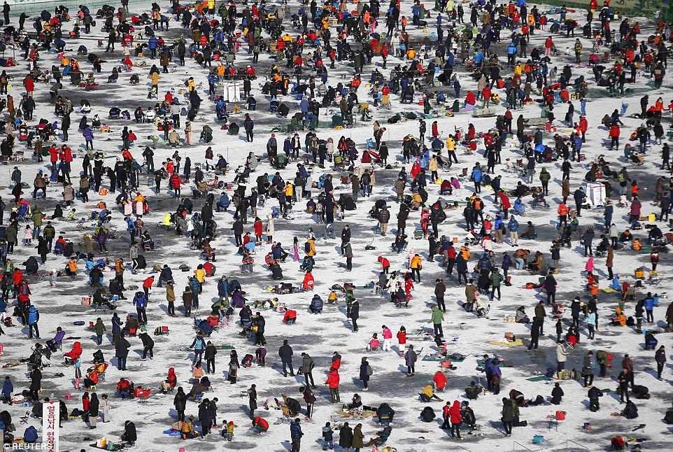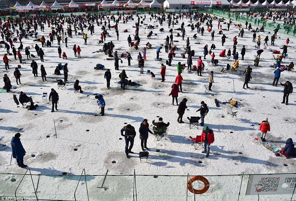 | Hơn 100.000 người đổ về sông băng ở huyện Hwacheon, tỉnh Gangwon để tham gia Lễ hội bắt cá hồi dưới băng hôm 10/1. Lễ hội cách khu vực phi quân sự giữa Triều Tiên và Hàn Quốc khoảng 20 km về phía nam. Ảnh: Getty Images |