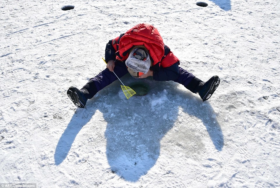 | Dòng sông tại tỉnh Gangwon-do là nơi đầu tiên đóng băng tại Hàn Quốc khi mùa đông tới. Mọi người chờ đợi kiên nhẫn quanh những hố nhỏ trên mặt băng và nhảy cẫng khi cá cắn câu. Ảnh: Getty |