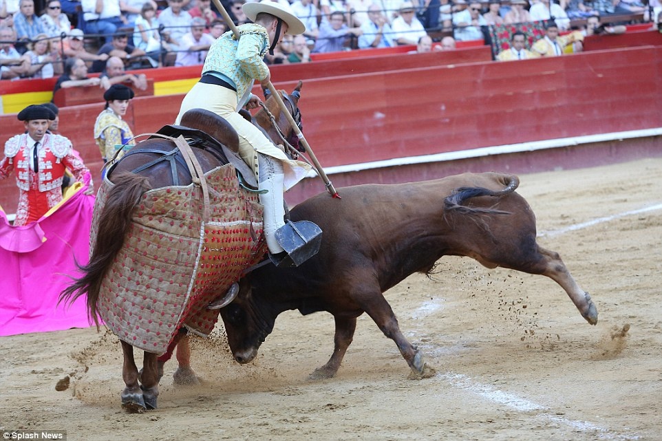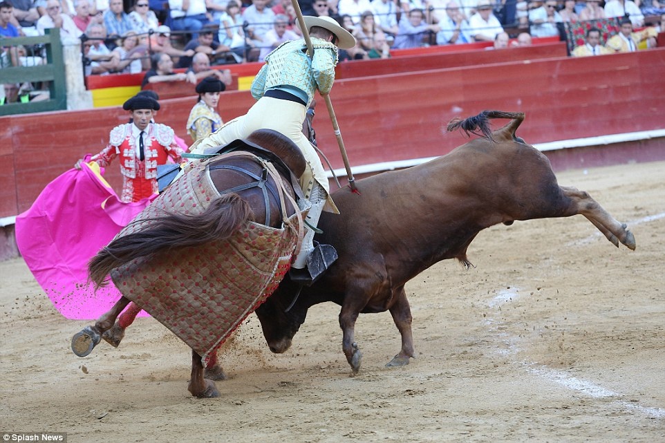 Dù bị thương do giáo đâm phải, bò tót vẫn cố gắng dùng sừng tấn công ngựa. |