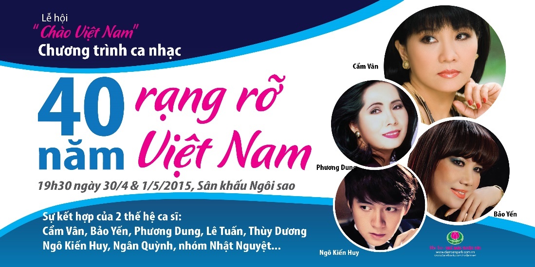 Trong khuôn khổ của lễ hội Chào Việt Nam, khách tham quan sẽ có cơ hội thưởng thức tiếng hát huyền thoại của các nữ danh ca Cẩm Vân, Bảo Yến, Phương Dung cùng những tình khúc vượt thời gian về Sài Gòn, ca khúc dân gian mượt mà sâu lắng của Ái Xuân, Hạnh Nguyên... trong chương ca vũ 40 năm - Rạng rỡ Việt Nam diễn ra lúc 19h30 ngày 30/4 và 1/5 tại sân khấu Ngôi Sao. Các bạn trẻ có thể hòa mình với điệu nhảy sôi động cùng các ca sĩ trẻ Nam Cường, Ngô Kiến Huy và Yến Trang.