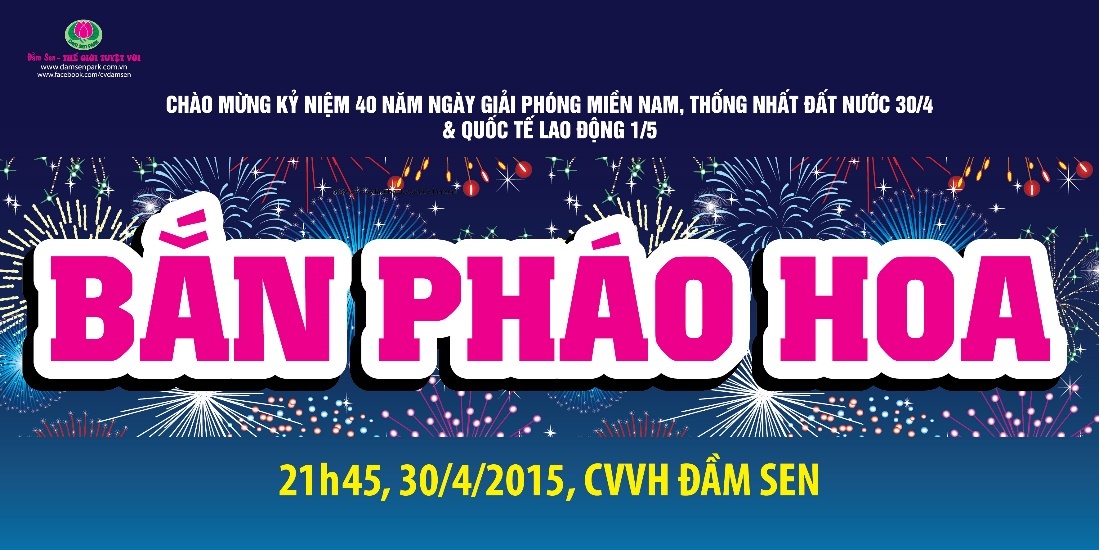 Những ai yêu thích màn pháo hoa rực rỡ thắp sáng trên bầu trời không thể bỏ qua địa điểm tuyệt vời tại Đầm Sen. Năm nay, màn bắn pháo hoa nghệ thuật hứa hẹn vô cùng ấn tượng và đẹp mắt với nhiều chủng loại pháo đủ họa tiết và màu sắc. Trận địa pháo bố trí ngay trên mặt hồ Đầm Sen, tạo nên hào quang rực rỡ nở rộ trên bầu trời chiến thắng và đẹp lung linh huyền ảo dưới mặt hồ. Chương trình bắn phoa hoa mừng lễ 30/4 tại Đầm Sen sẽ diễn ra lúc 21h45 ngày 30/4 tại Cầu Cửu Khúc.