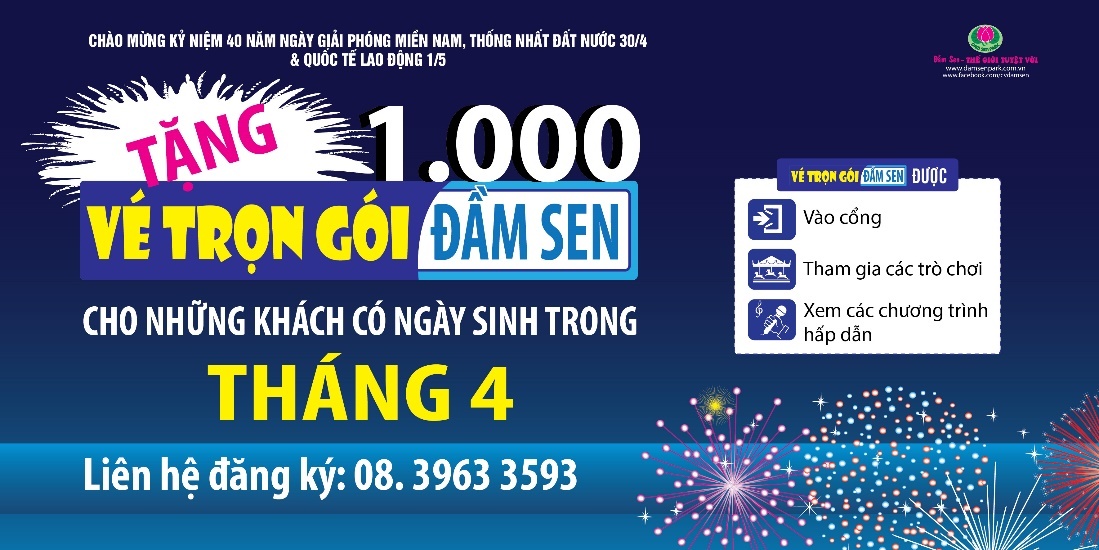 Đặc biệt, Đầm Sen ưu đãi tặng vé trọn gói cho du khách sinh trong tháng 4 (của bất kỳ năm sinh nào). Sẽ có 1.000 vé dành tặng cho 1.000 khách đăng ký sớm nhất qua số điện thoại (08) 3963 3593 hoặc qua email phongtourdamsen@gmail.com.