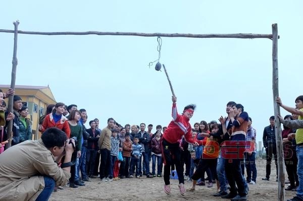 Thanh niên chơi trò chơi dân gian phía bên ngoài đình làng.