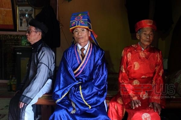 Các bô lão ở trong Đình làng Ném Thượng đợi đến giờ làm lễ cúng tế.