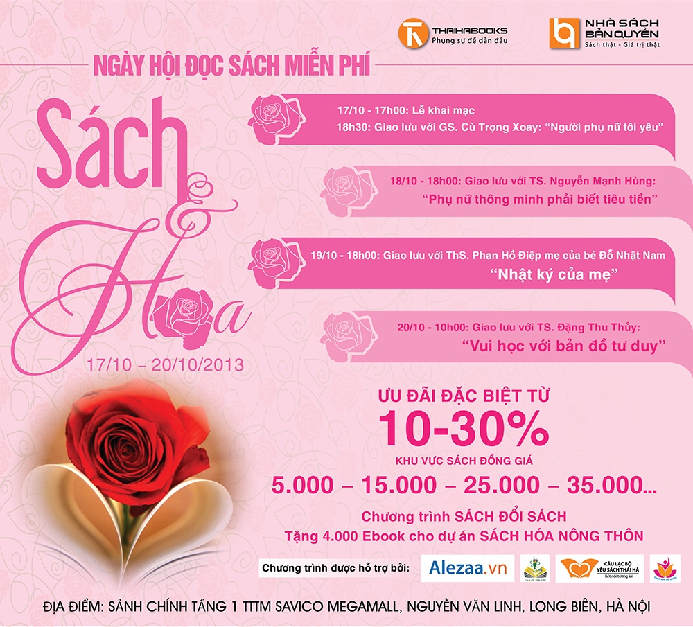 Tháng 10 với mùa thu Hà Nội, không thể không nhắc đến vai trò của người phụ nữ trong ngày 20/10. Để tôn vinh người phụ nữ Việt Nam cũng như tôn vinh văn hóa đọc, trung tâm thương mai Savico Megamall phối hợp cùng công ty Cổ phần Sách Thái Hà tổ chức chuỗi chương trình mang tên Ngày hội đọc sách miễn phí với chủ đề Sách & Hoa. Chuỗi chương trình diễn ra từ ngày 17- 20/10 tại trung tâm thương mại Savico Megamall, số 7-9 Nguyễn Văn Linh - Long Biên, Hà Nội với rất nhiều hoạt động ý nghĩa và phong phú.