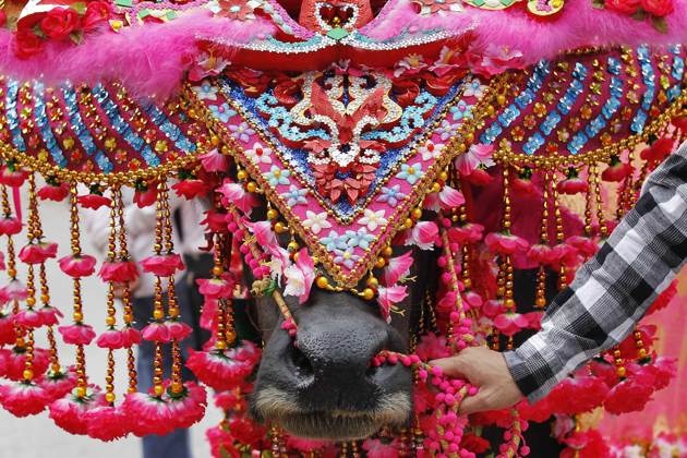 | Một con trâu được trang điểm sặc sỡ. Lễ hội cũng là dịp để những người nông dân khoe những con trâu quý của họ. Ảnh: Reuters |