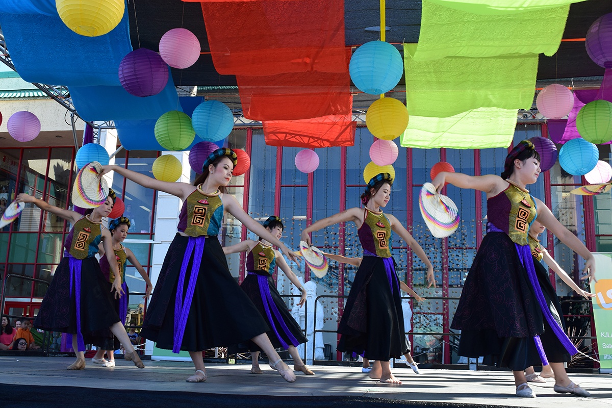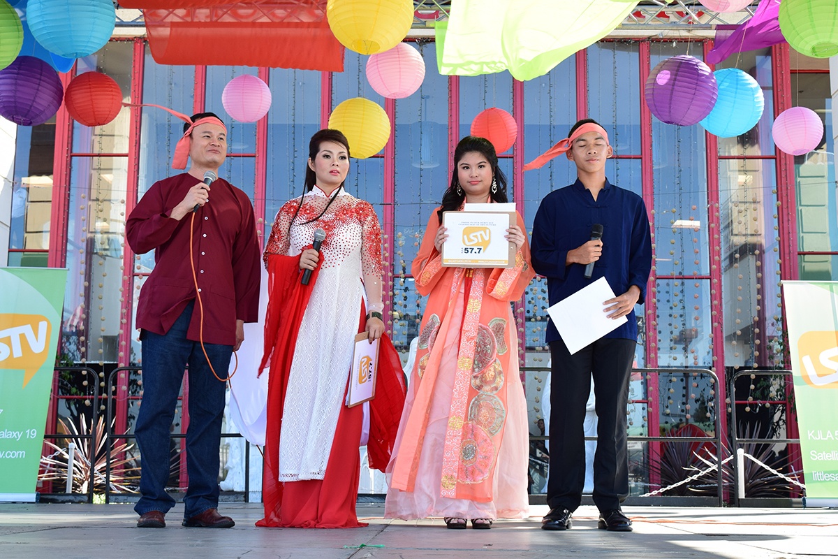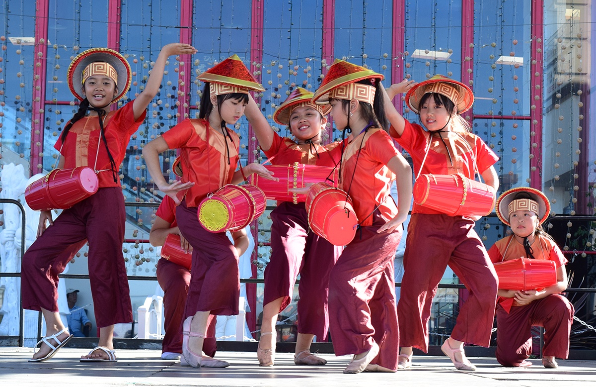 | Màn múa Ngày mùa của bà con người Việt tại Mỹ. Sân khấu trước Thương xá Phước Lộc Thọ được trang trí những chiếc đèn lồng và sẽ được thắp sáng trong đêm trăng. |