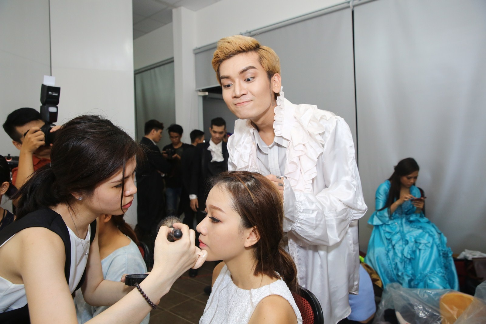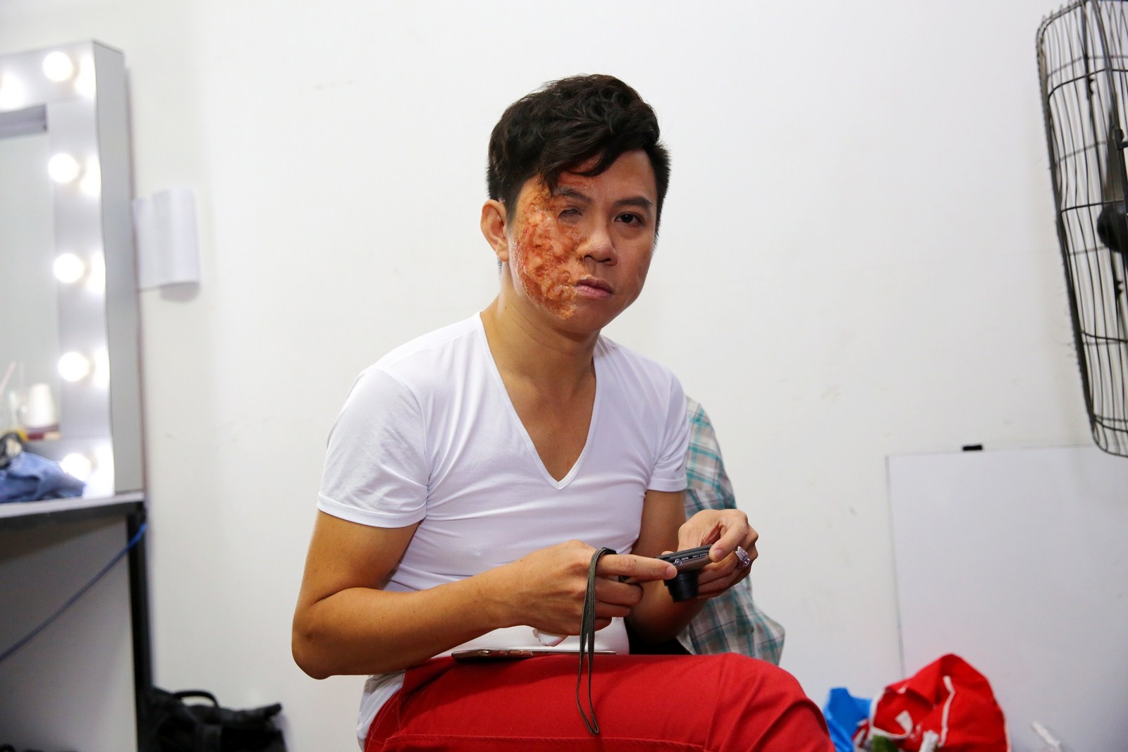 Quốc Đại mất nhiều thời gian để nhân viên hóa trang vẽ gương mặt cho anh. |