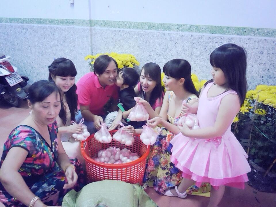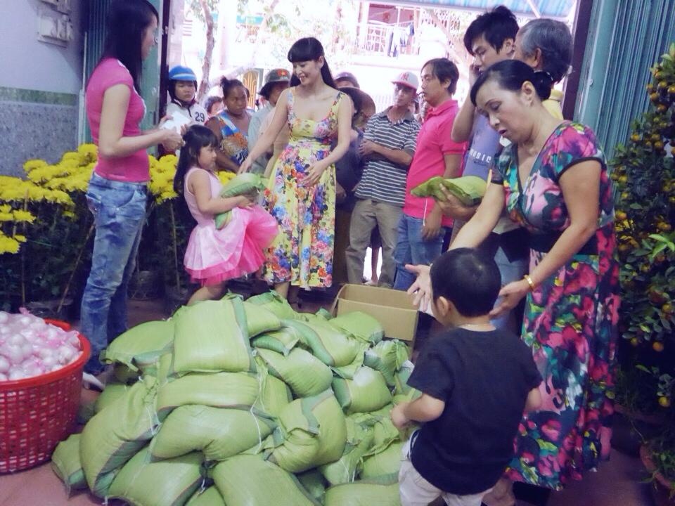 Lê Kiều Như và người thân vui vẻ gửi tặng tới mọi người những món quà nho nhỏ gồm có gạo và trứng...