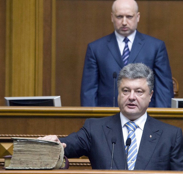 | Ông Poroshenko đặt tay lên cuốn Kinh thánh khi đọc lời tuyên thệ nhậm chức để trở thành tổng thống thứ 5 của Ukraina. Ảnh: AFP |