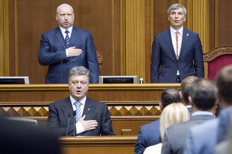 | Tân tổng thống và các nghị sĩ đứng dậy khi hát quốc ca Ukraina. Ảnh: AFP |