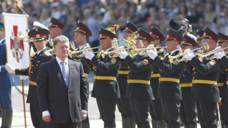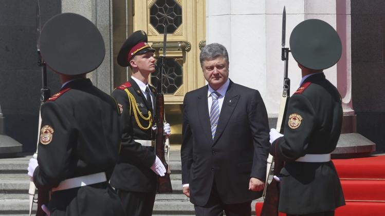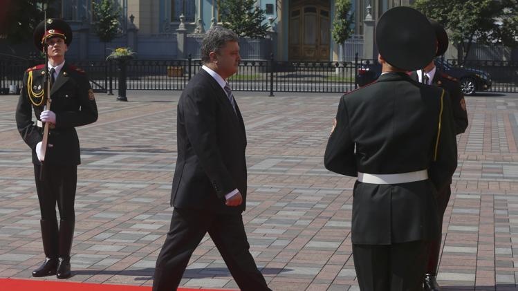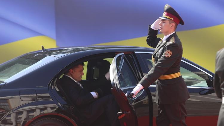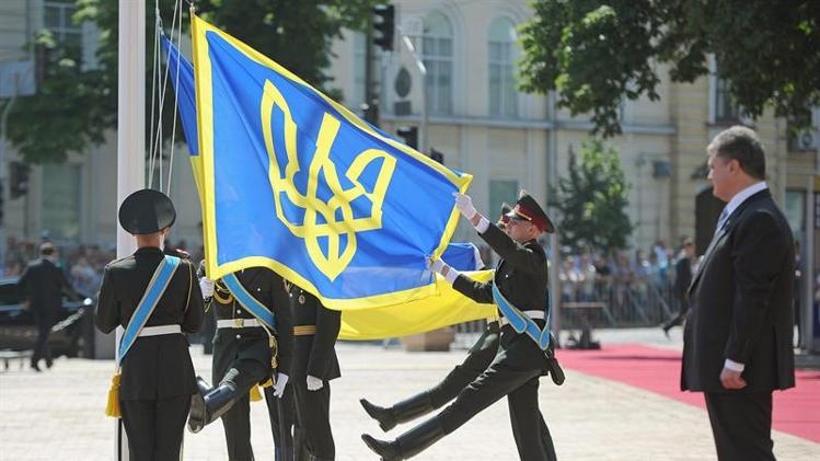 | Tân tổng thống Ukraina chứng kiến lễ treo quốc kỳ và cờ tổng thống tại quảng trường Sophia sau lễ nhậm chức của ông. Ảnh: AP |
