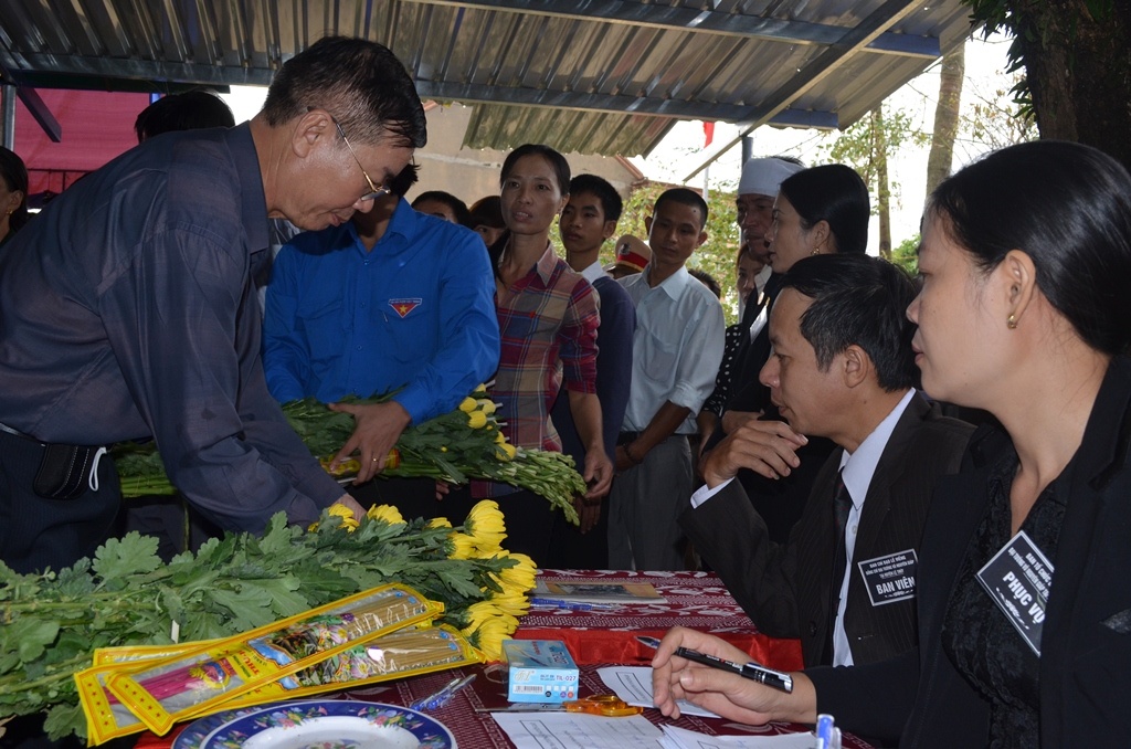 Người dân Lộc Thủy mang hoa tươi, lần lượt xếp hàng đăng ký với Ban tang lễ để được vào thắp hương cho Người.