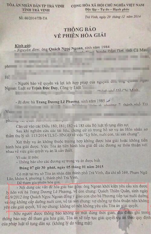 | Văn bản ly hôn của Ngọc Ngoan và Lê Phương. |