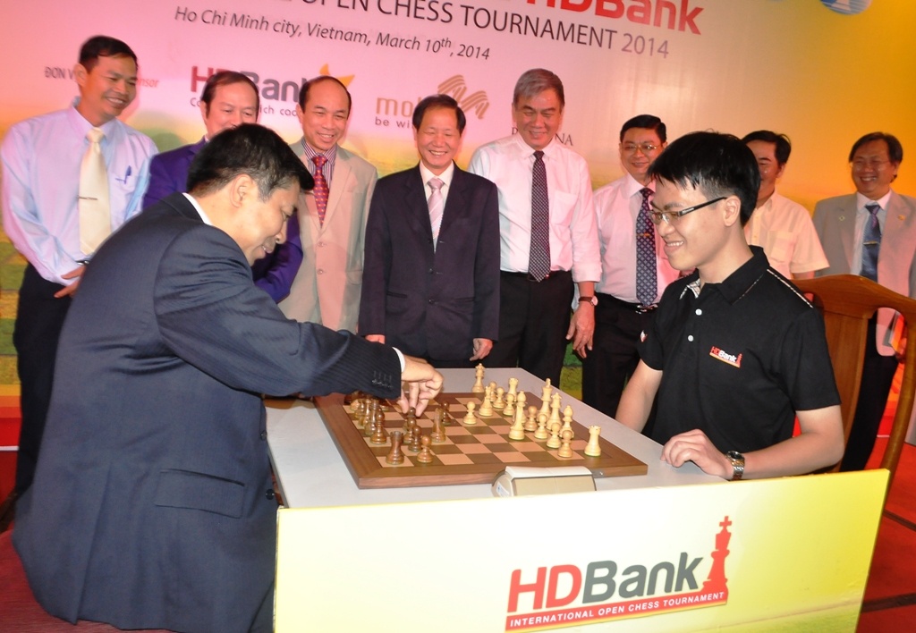 | Lê Quang Liêm cùng đại diện HD Bank đánh ván cờ tượng trưng trong buổi lễ khai mạc diễn ra sáng 10/3. |