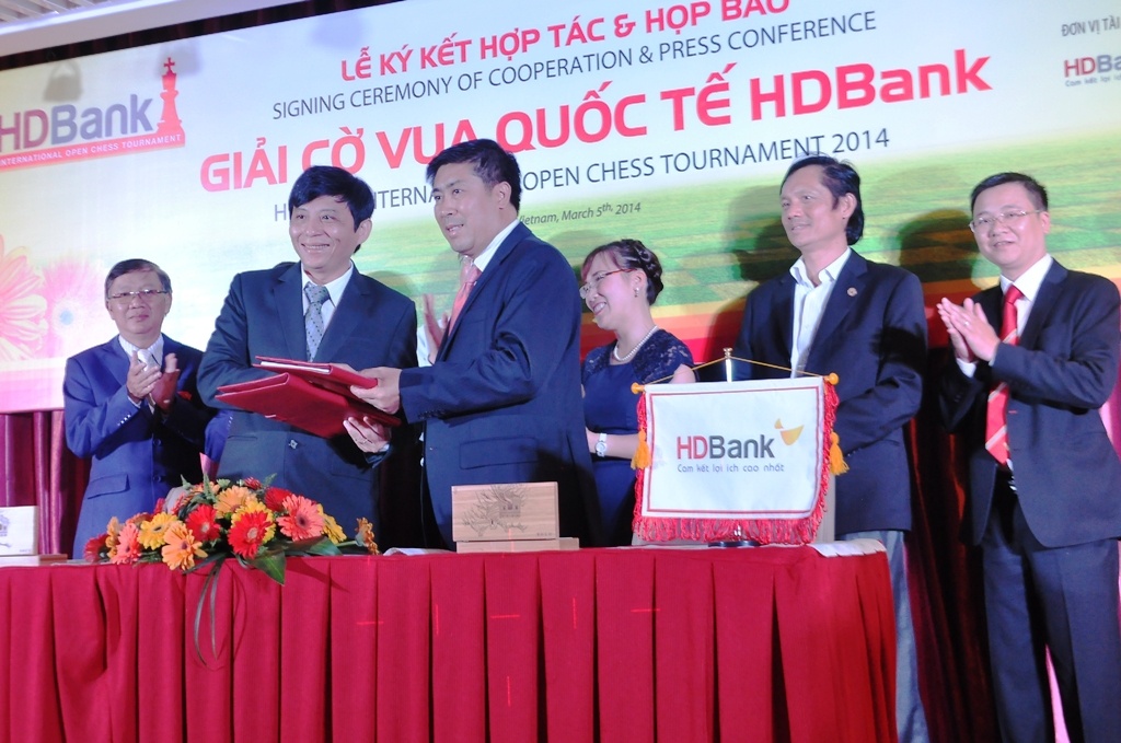 | Đại diện Liên đoàn cờ Việt Nam ký hợp đồng với HD Bank, cam kết duy trì giải trong 5 năm tới. |