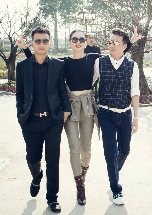 | Giọng ca Hãy trả lời em cười rạng rỡ khi chụp ảnh tình tứ bên đàn anh. |