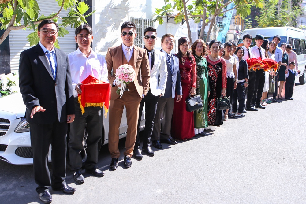 Cô dâu và chú rể chụp ảnh cùng bố mẹ 2 bên. Quốc Cơ là con trưởng trong gia đình trong khi Hồng Phượng là thứ nữ.