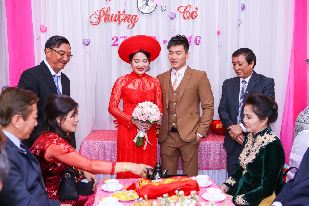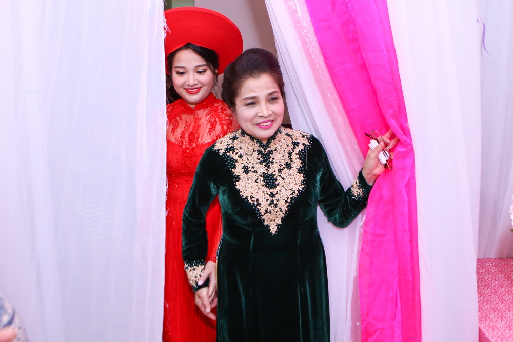 Mẹ MC Hồng Phượng dắt tay con gái ra mắt họ nhà trai. Nữ MC sinh năm 1984 mặc áo dài truyền thống trong ngày cưới.