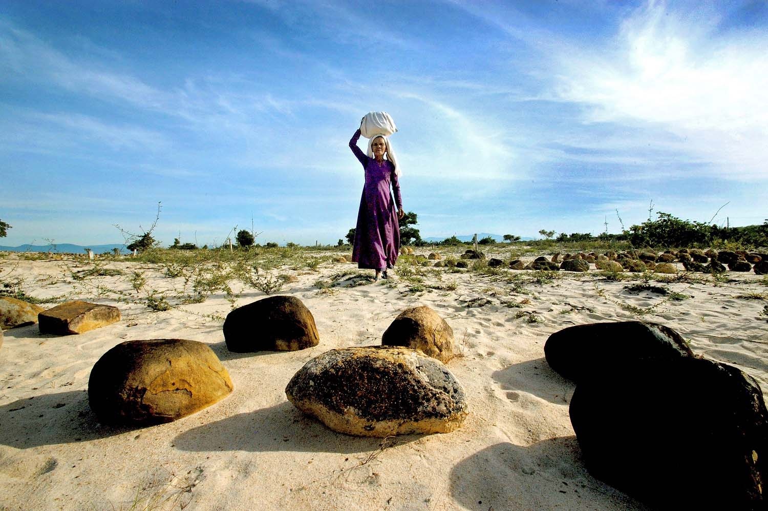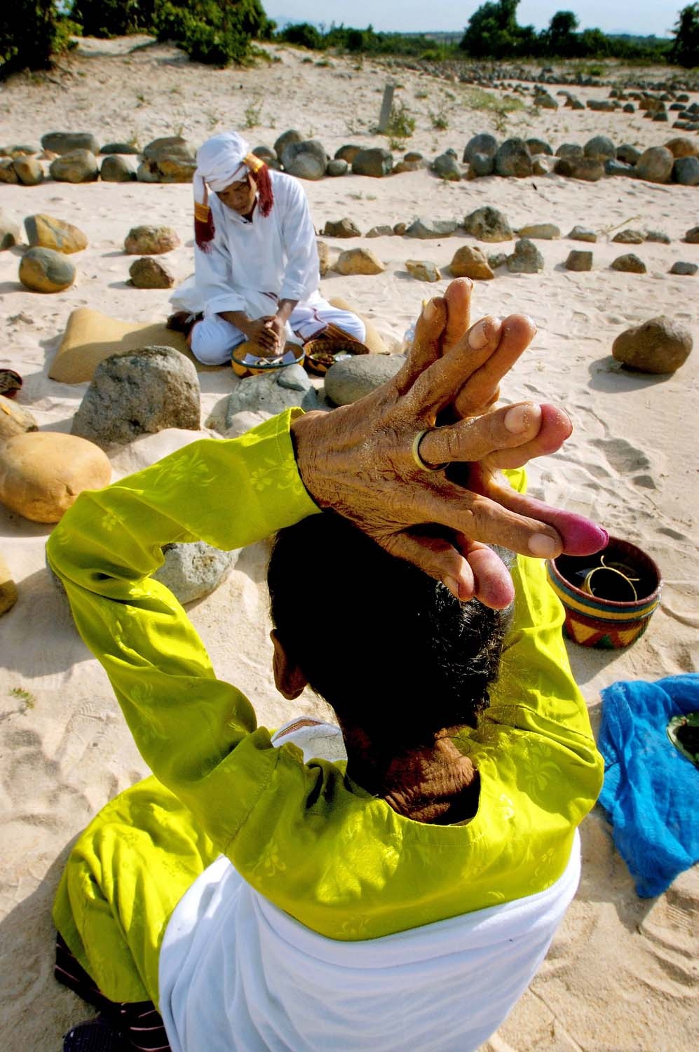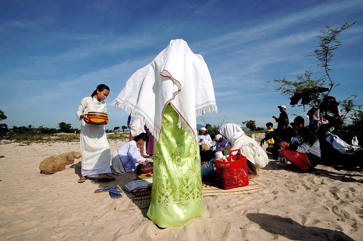 Dưới cái nắng chói chang giữa mùa hè miền Trung, những người phụ nữ nằm úp mặt sát mặt cát nóng bỏng để vái lạy.