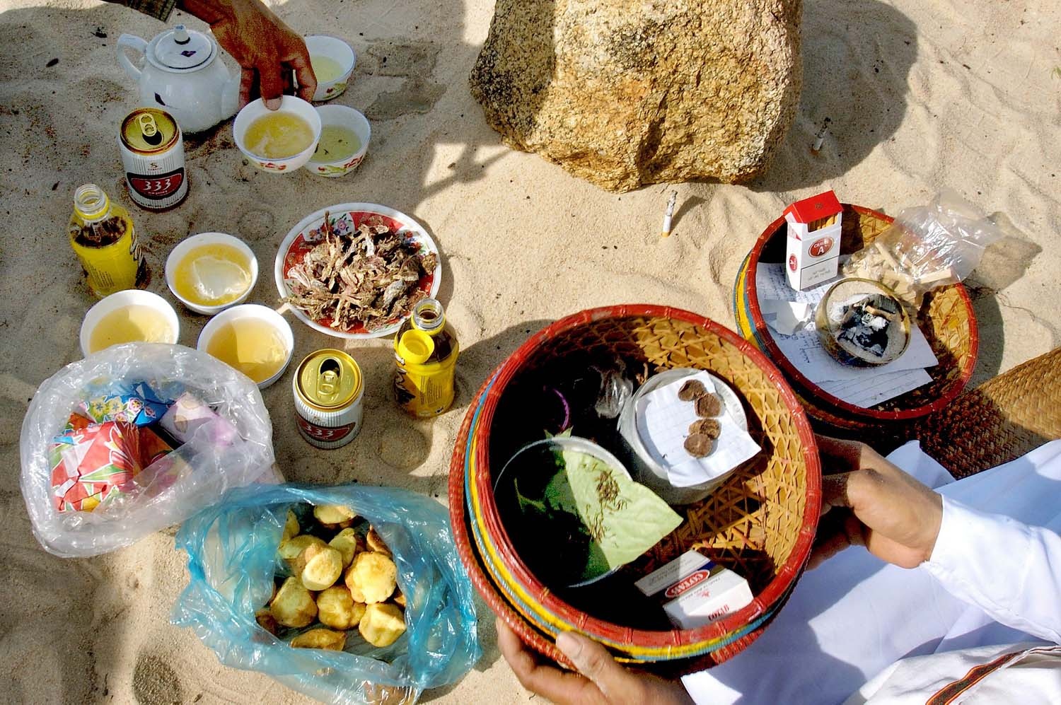 | Lễ vật để cúng rất đơn giản, gồm bia, nước trà đóng chai, lá trầu không, bánh hoặc những con mực khô, cá khô. |