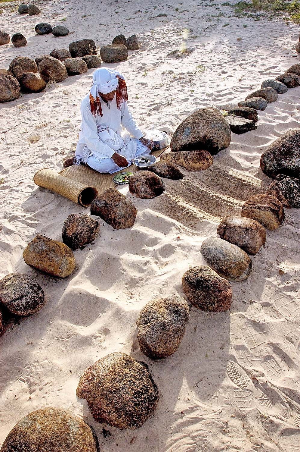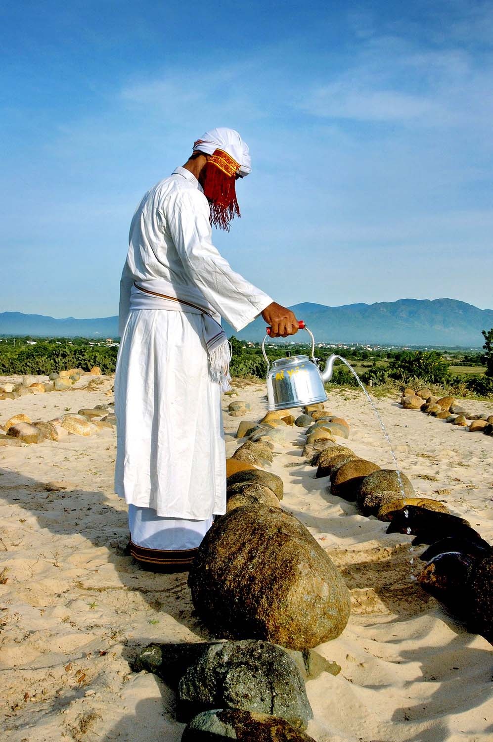 | Tiếp theo là nghi thức xức dầu lên ngôi mộ bằng cái tách nhỏ đựng dầu và một ít bông gòn chấm lên hòn đá. |
