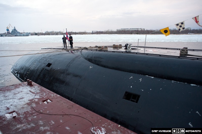 | Tàu ngầm hạt nhân chiến lược Alexander Nevsky mang 16 tên lửa đạn đạo liên lục địa phóng từ tàu ngầm RSM-56 Bulava với tầm bắn khoảng 10.000 km. Mỗi tên lửa mang theo 6 đầu đạn hạt nhân độc lập với đương lượng nổ 150 Kt mỗi đầu đạn. Ảnh: Rianovosti. |