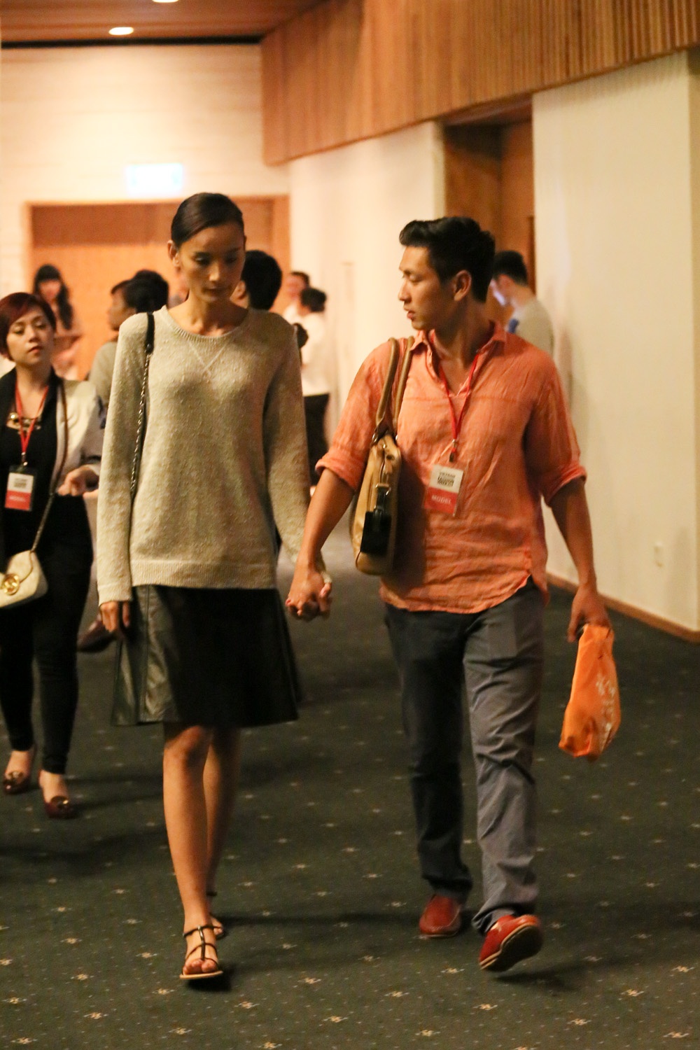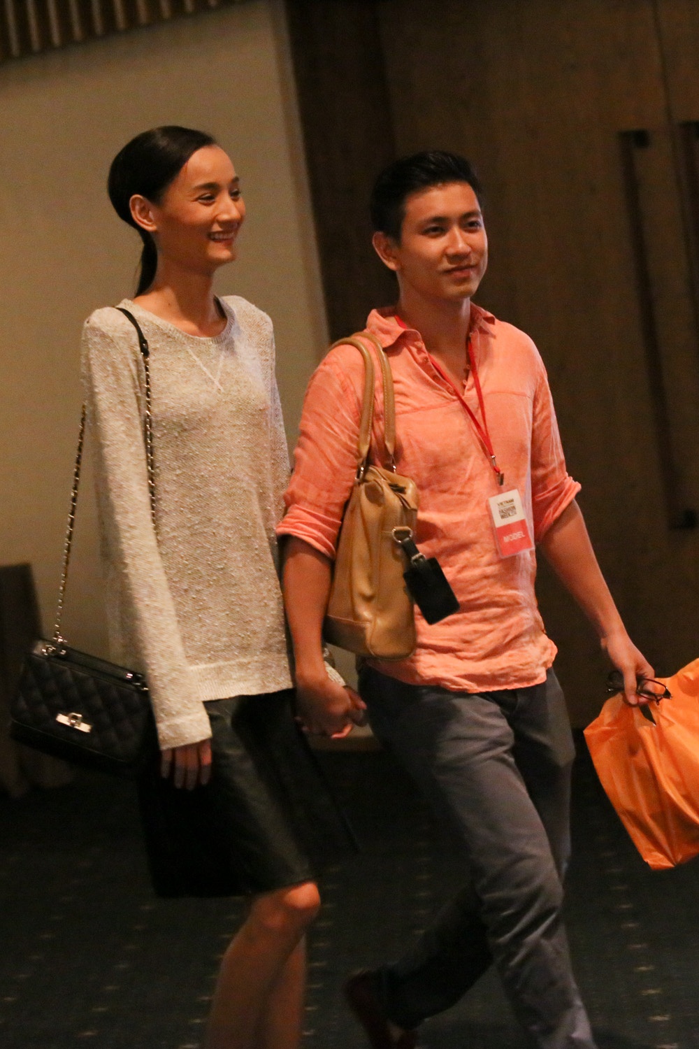 | Lê Thúy cười rạng rỡ khi được hôn phu chờ đợi và đưa đón phía hậu trường. Khi cả hai đi bên nhau, người đẹp vượt trội hơn hẳn bạn trai về chiều cao, song cặp đôi luôn nắm chặt tay nhau, gương mặt tươi tắn, hạnh phúc. |
