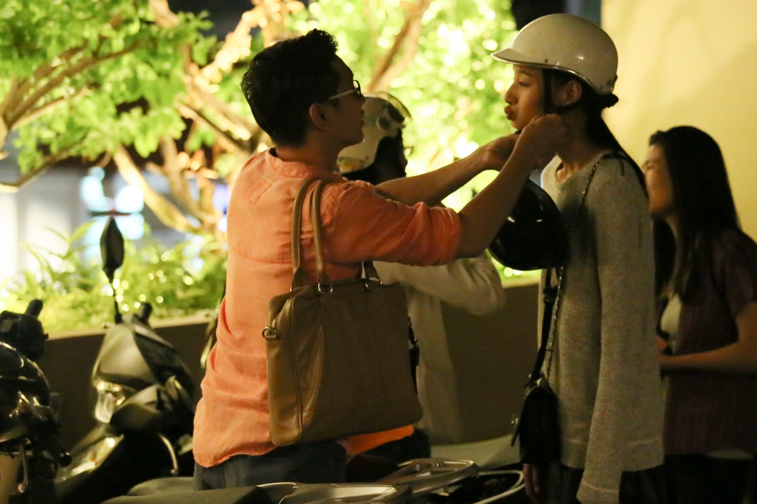 | Ra đến điểm để xe, anh còn cẩn thận tự tay đội mũ bảo hiểm cho Lê Thúy. Nữ người mẫu chu miệng tinh nghịch, trêu chọc bạn trai. |