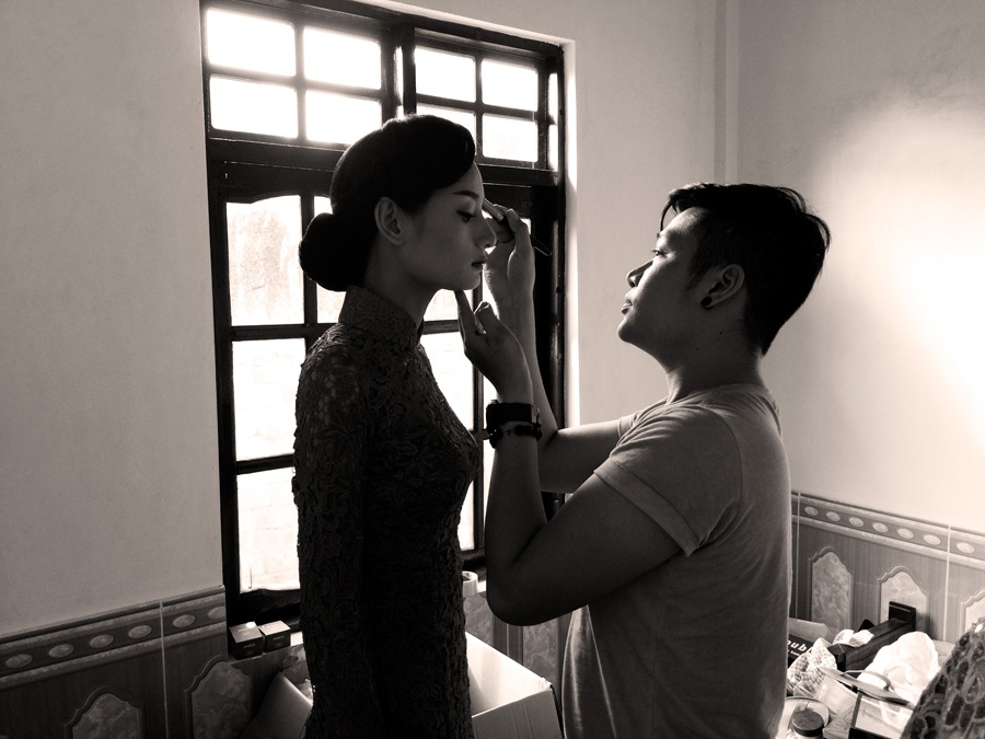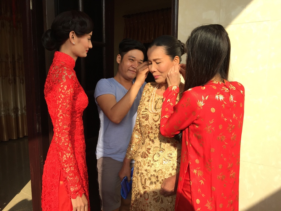 | Phía trong nhà, mẹ của nữ người mẫu tất bật với công tác chỉn chu trang phục. Bà diện áo dài gam vàng sang trọng, được người thân phụ giúp đeo trang sức, trước khi bước vào nghi lễ chính thức. |