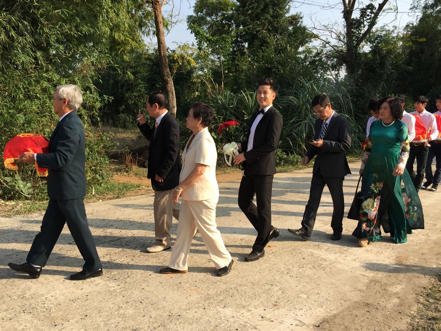 | Chú rể và đoàn nhà trai đến chạm ngõ nhà gái vào đầu giờ chiều. Chú rể Đỗ Khải An diện trang phục vest bảnh bảo, hoan hỉ khi bước về phía tư gia nhà bạn gái. |