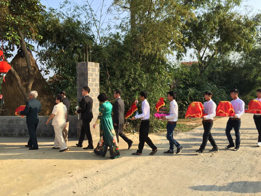 Đoàn nhà trai bê sính lễ theo đúng phong tục truyền thống, lần lượt tiến vào nhà Lê Thúy. Do đường xá xa xôi nên họ nhà trai chỉ cử đại diện người thân về quê cô dâu tham dự lễ ăn hỏi. Dù vậy ngày vui của cặp đôi vẫn ngập đầy tiếng cười và hạnh phúc.