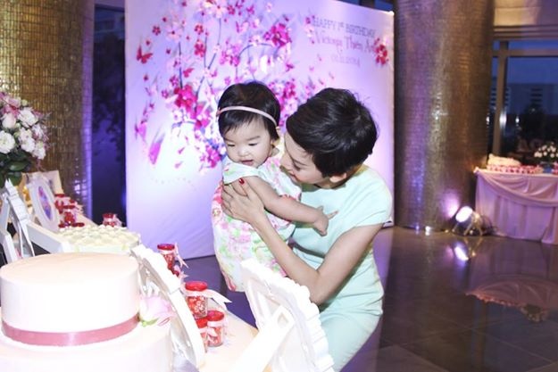 | Sau những ồn ào về bố ruột của bé Thỏ trong thời gian qua, Xuân Lan quyết định tổ chức cho con gái một bữa tiệc sinh nhật đầu tiên ấm cúng, hoành tráng với sự góp mặt của bạn bè thân thiết. Trong sự kiện, bé Thỏ được mẹ diện váy hoa, đi giày búp bê màu hồng. |