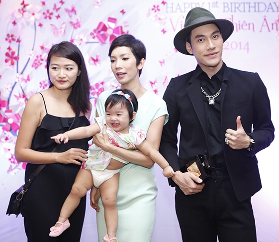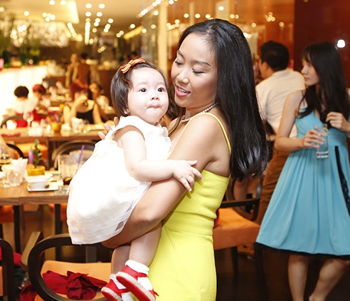 | Nữ ca sĩ Đoan Trang bế con gái 7 tháng tuổi đến bữa tiệc. Cô bé mang vẻ đẹp lai khiến nhiều người yêu thích. |